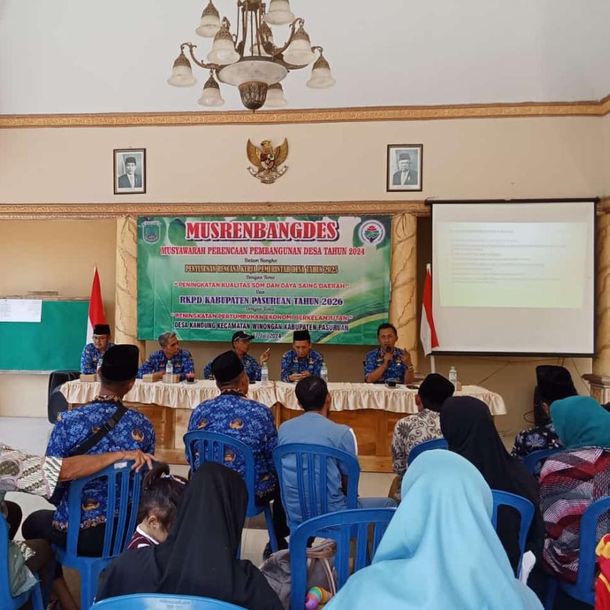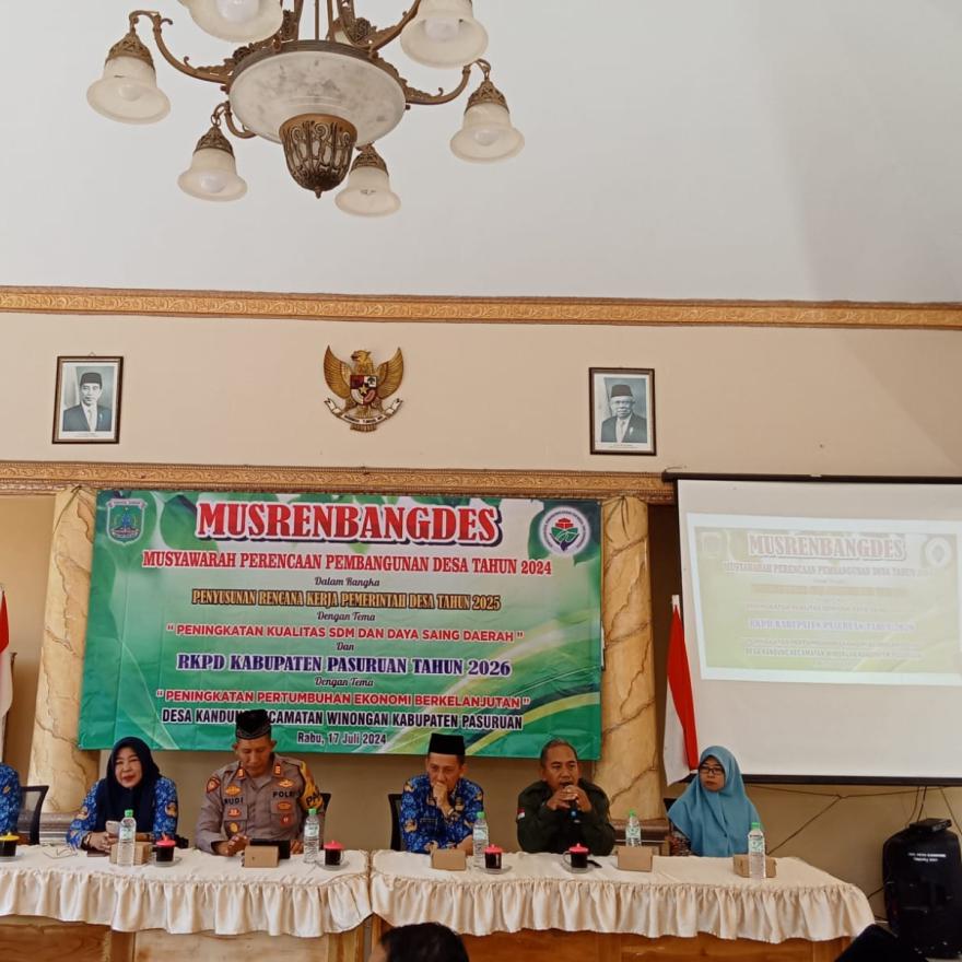 Pemerintah Desa Kandung melaksanakan MUSRENBANGDES (Musyawarah Perencanaan Pembangunan Desa Tahun 2024) dalam rangka Penyusunan Rencana Kerja Pemerintah Desa Tahun 2025 dengan tema "Peningkatan Kualitas SDM dan Daya Saing Daerah" dan RKPD Kabupaten Pasuruan Tahun 2026 dengan tema "Peningkatan Pertumbuhan Ekonomi Berkelanjutan" yang dilaksanakan di Balai Desa Kandung pada hari Rabu, 17 Juli 2024 pukul 08:00 sampai selesai. Kegiatan rutin tahunan ini dihadiri oleh Bpk Camat Winongan (M.Ganis Subintang, S.STP, M.Si), Ibu Rusmini S.Si selaku kepala seksi pemerintahan dan pelayanan, Bpk Dodik Hariyadi, SE selaku kepala seksi pemberdayaan masyarakat desa, Bpk Abd Majid Jalil selaku staf seksi pemberdayaan masyarakat desa, Kapolsek dan Danramil Winongan, Pendamping Desa, Pendamping PKH, Kepala Desa beserta Perangkat Desa Kandung, Lembaga Desa, BPD, Kelompok Kader, Ketua RT/RW, Tokoh-tokoh masyarakat.