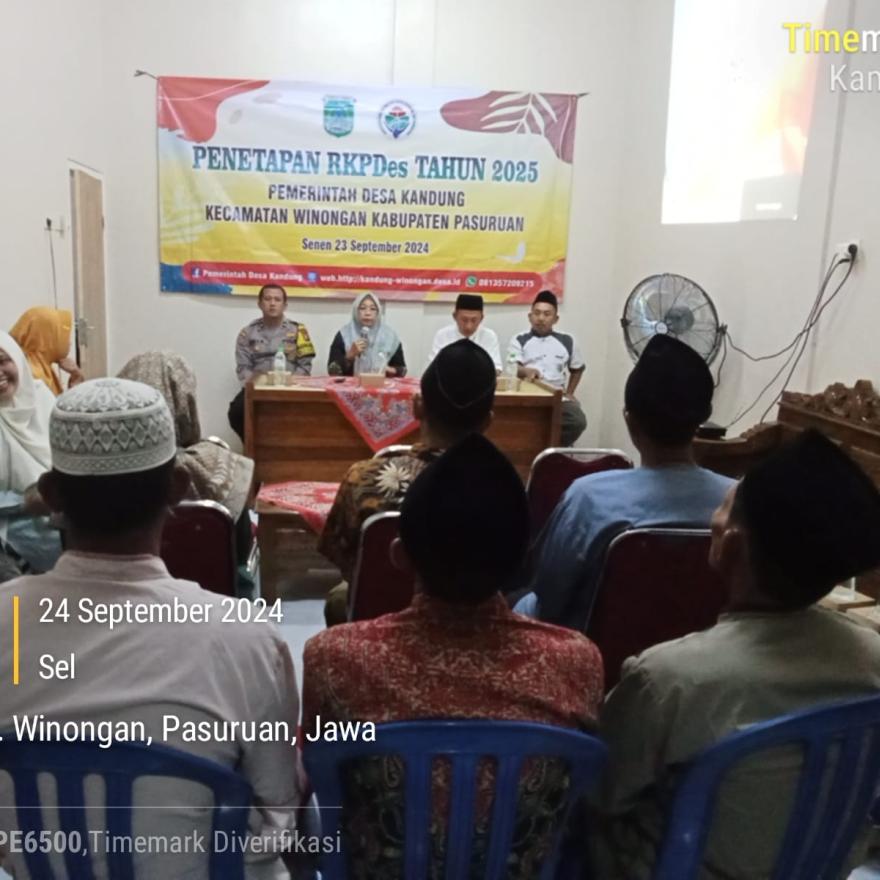 Penetapan RKPDes Tahun 2025 Pemerintah Desa Kandung Kecamatan Winongan Kabupaten Pasuruan, yang dilaksanakan pada hari selasa, 24 September 2024 pukul 19:00 WIB bertempat di ruang pertemuan Desa Kandung.