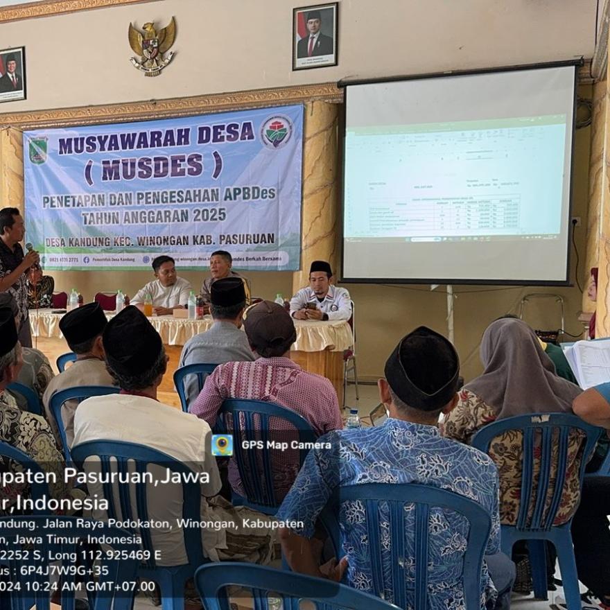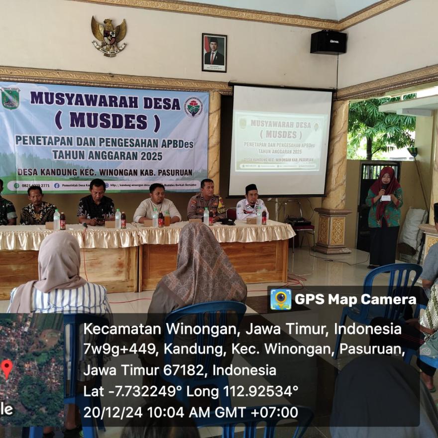 Pada hari Jum’at, 20 Desember 2024 Pemerintah Desa Kandung bersama BPD telah melaksanakan kegiatan Musyawarah Desa Penetapan dan Pengesahan APBDes Tahun Anggaran 2025. Kegiatan musyawarah ini bertempat di Balai Desa Kandung yang secara langsung dihadiri oleh Bapak Camat Winongan beserta Staf, Bapak Kapolsek Winongan / yang mewakili, Bapak Danramil / yang mewakil, Pendamping Desa Tingkat Kecamatan dan Pendamping Lokal Desa (PLD), Bapak Kepala Desa Kandung beserta Perangkat Desa, Ketua BPD beserta Anggota, Bapak RT/RW, Karang Taruna, Ketua TP PKK / yang mewakili, Tokoh Agama dan Masyarakat serta Warga Masyarakat Desa Kandung. Dengan terlaksananya kegiatan Musyawarah Desa Penetapan dan Pengesahan APBDes Tahun Anggaran 2025, pertanda bahwa semua program yang akan dilaksanakan oleh Pemerintah Desa Kandung di Tahun 2025 telah tersusun. Berikut adalah beberapa langkah umum yang biasanya dilakukan dalam proses tersebut :