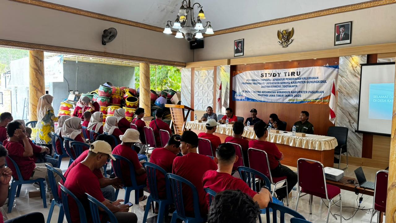 Tujuan dari kegiatan study tiru ini adalah menambah wawasan dan pengetahuan serta pengalaman dalam peningkatan kapasitas aparatur pemerintah desa yang efektif, inovatif dalam pelayanan masyarakat. Jika dalam penyambutan ini terdapat kekurangan, kami mohon maaf yang sebesar – besarnya. Semoga dalam pertemuan ini membawa maanfaat bagi kita semua dan menyambung tali silaturrahmi antara Pemerintah Desa Kandung Kecamatan Winongan Kabupaten Pasuruan Jawa Timur dengan Kalurahan Ngeposari Kapanewon Semanu Kabupaten Gunungkidul Daerah Istimewa Yogyakarta.