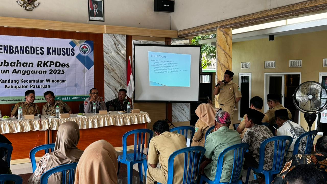 Dalam pertemuan ini Kasi PMD dari Kecatamatan Winongan menambahkan bahwasanya MUSRENBANGDES KHUSUS Perubahan RKPDes Tahun Anggaran 2025 ini sangat penting untuk memastikan RKPDes tepat sasaran sehingga tidak menyalahi aturan yang berlaku. Harapan dari kegiatan ini bisa dapat menghasilkan keputusan yang bermanfaat bagi masyarakat.