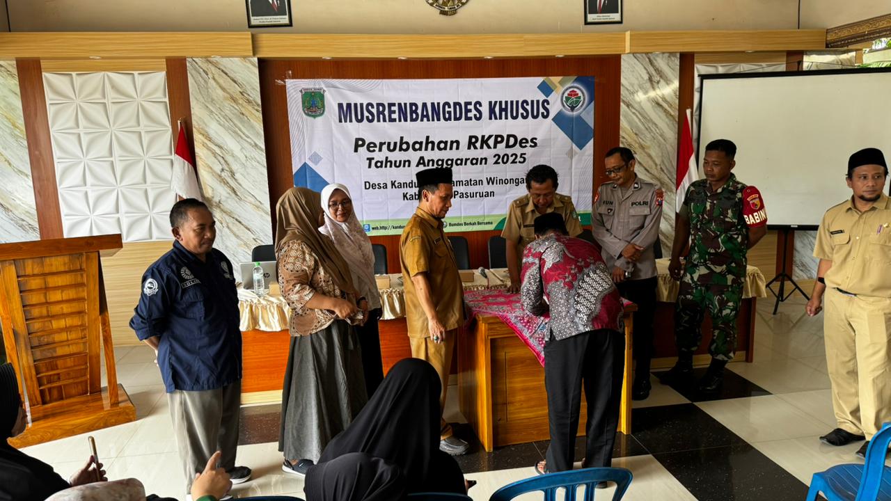 Pemerintah Desa Kandung telah melaksanakan kegiatan MUSRENBANGDES KHUSUS Perubahan RKPDes Tahun Anggaran 2025 pada hari Selasa, 04 November 2025 yang bertempat di Balai Desa Kandung. Kegiatan tersebut dihadiri oleh tim Kecamatan Winongan, Kapolsek Winongan, Danramil Winongan, Pendamping Lokal Desa, Kepala Desa Kandung beserta Perangkat dan Staffnya, BPD, RT, RW, dan Warga Masyarakat Desa Kandung.